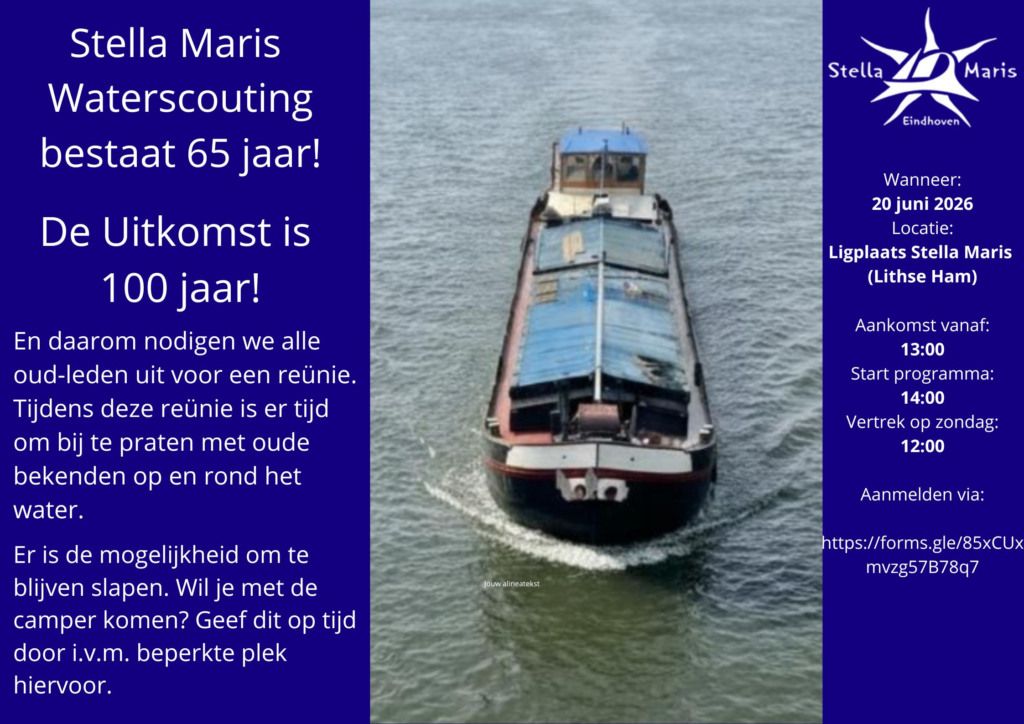 In 2026 vieren we twee bijzondere jubilea: Stella Maris Waterscouting bestaat 65 jaar en De Uitkomst bereikt de mijlpaal van 100 jaar. Ter ere van deze unieke gelegenheid organiseren we een grote reünie voor alle oud‑leden.